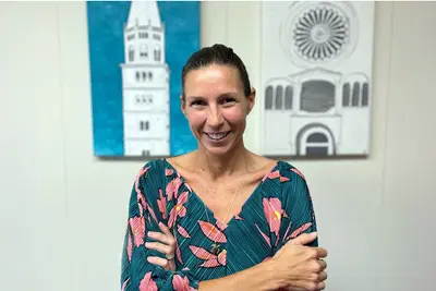 • Guilia Po Delisle in front of two art pieces.