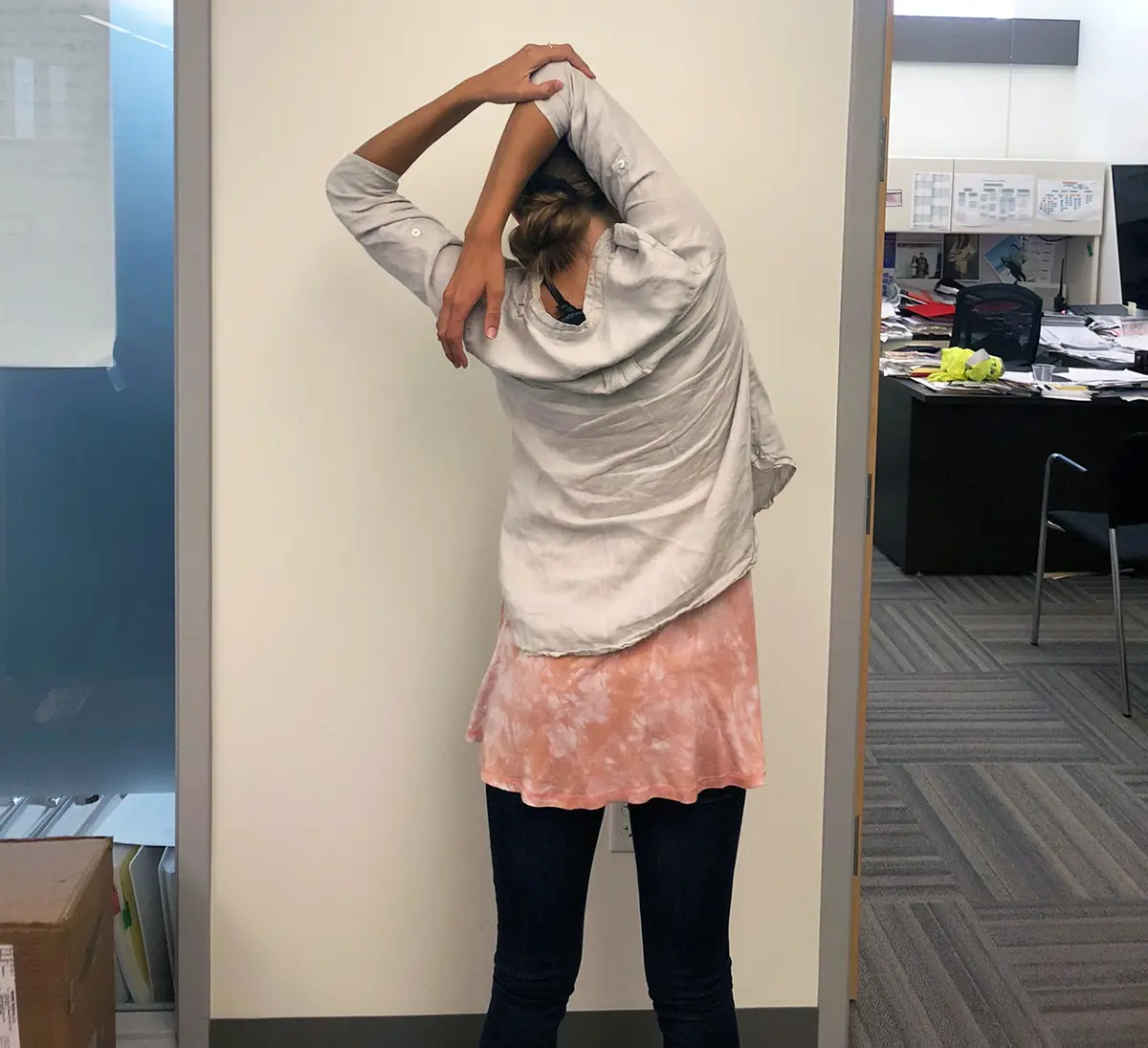 - Bend at the elbow so that you touch the left shoulder with the right hand