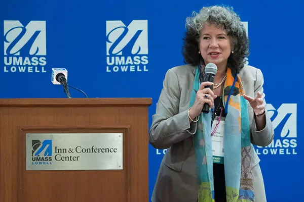 The conference opened with a conversation between designer and TV personality Taniya Nayak ’97 and Chancellor Jacquie Moloney, the first women chancellor of UMass Lowell, about Nayak’s sometimes bumpy road to success, including flunking out of the university her freshman year.