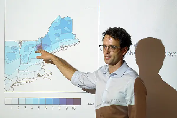 Chris Skinner, who joined the Kennedy College of Sciences in January as an assistant professor of EEAS, led teachers through an exercise that projects the declining number of snow days that New England schools will have as a result of global warming.