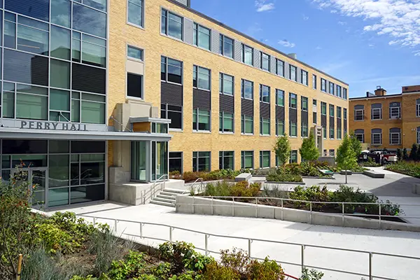 The university has transformed the former parking lot between Cumnock, Ball and Perry halls into an inviting outdoor plaza with accessible walkways connecting the North Campus buildings. Students can now relax on courtyard benches between classes, surrounded by a well-manicured landscape of freshly planted trees and shrubs.