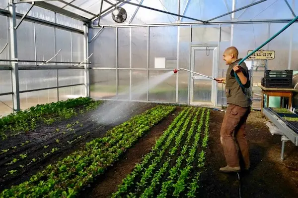 “The greenhouse is a delightful place to work right now,” says Ali Jacobs, director of programs for Mill City Grows, the Lowell-based urban farming nonprofit that manages the site in partnership with the university’s Office of Sustainability. “There’s little in the world that’s better for reducing anxiety than watering some baby vegetables.”