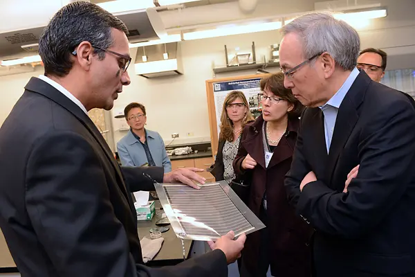Nagarajan with former U.S. Energy Secretary and Nobel Laureate Steven Chu during the latter’s campus visit in 2016.