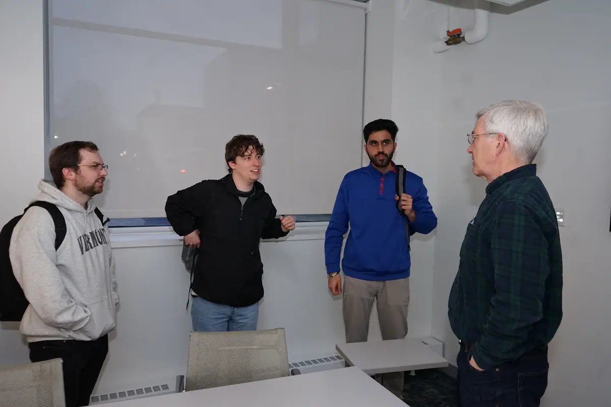 WindHawks members, from left, Evan Anctil, Adam Freedman and Sarvesh Handa '24 chat with advisor Stephen Johnson '21 during a recent team meeting at Perry Hall.