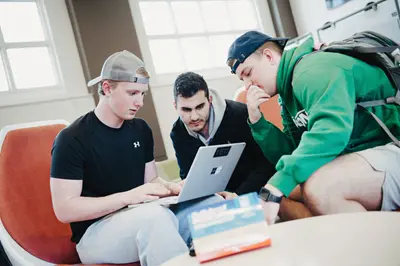 • Four students in front of Leitch Hall with welcome sign above the doors